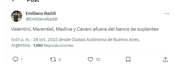 Según adelantó el periodista Emiliano Raddi, Jorge Almirón decidió cuidar a Nicolás Valentini, Miguel Merentiel, Cristian Medina y Edinson Cavani. Los cuatro quedaron afuera del banco de suplentes y serían titulares el próximo sábado ante Fluminense por la final de la Copa Libertadores.