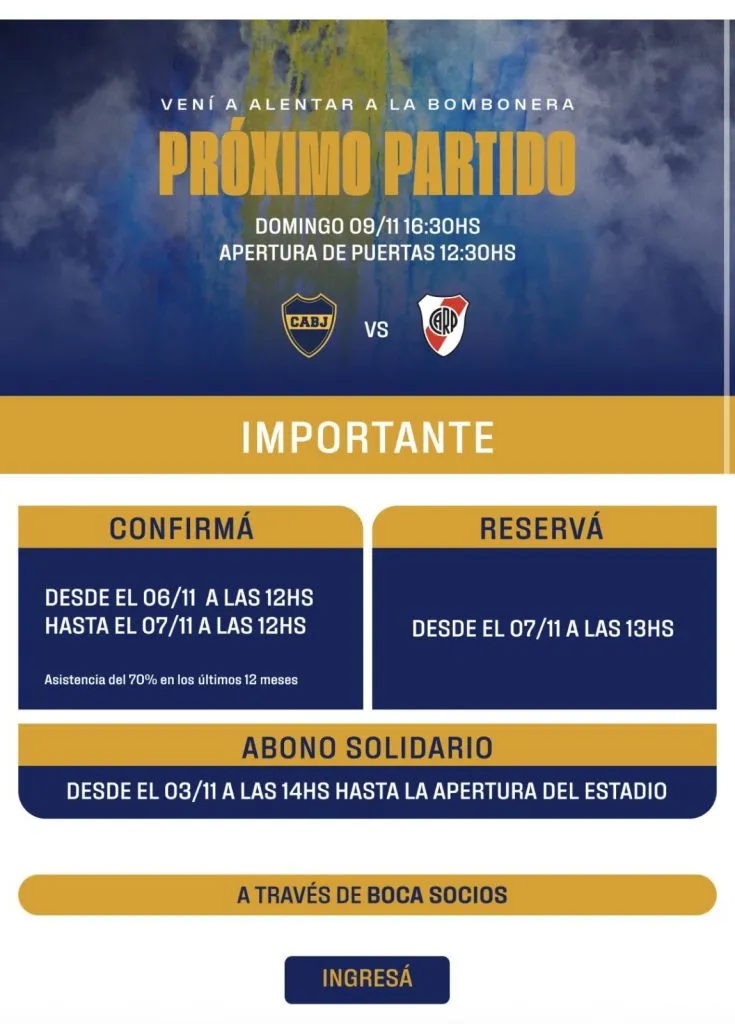 Desde los medios oficiales del Xeneize, se confirmó que los socios deberán confirmar su presencia desde el 6 de noviembre a partir de las 12 horas. A su vez, hay tiempo para hacerlo hasta el 7 a la misma hora. Boca confirmó el filtro para el partido y cada hincha deberá contar con un 70% de asistencia en el último año para tener su entrada.