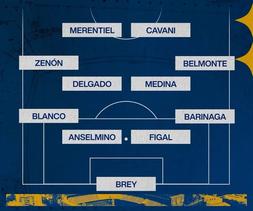 Los 11 que dispuso en la última práctica son los elegidos para afrontar este encuentro por la Liga Profesional: Leandro Brey; Juan Barinaga, Nicolás Figal, Aaron Anselmino, Lautaro Blanco; Tomás Belmonte, Milton Delgado; Miguel Merentiel, Cristian Medina, Kevin Zenón; Edinson Cavani.