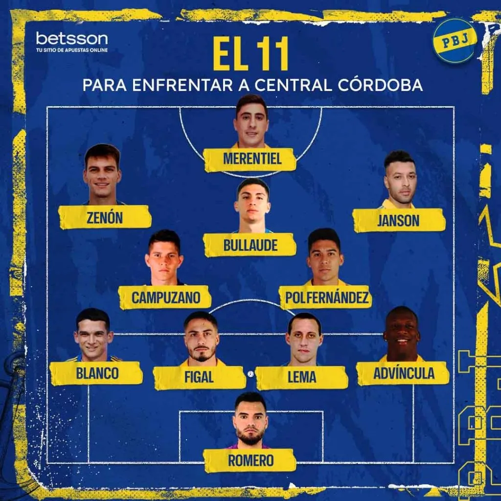 El Xeneize va con Sergio Romero; Luis Advíncula, Cristian Lema, Nicolás Figal, Lautaro Blanco; Guillermo Fernández, Jorman Campuzano; Kevin Zenón, Ezequiel Bullaude, Lucas Jansón; Miguel Merentiel.