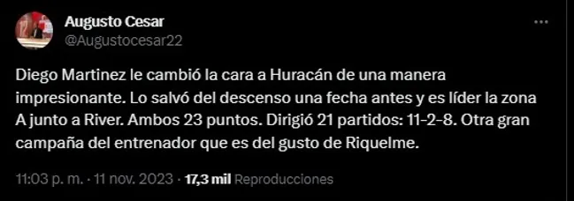 Respecto a esto, la fuente citada agregó: “Diego Martinez le cambió la cara a Huracán de una manera impresionante. Lo salvó del descenso una fecha antes y es líder la zona A junto a River. Ambos 23 puntos. Dirigió 21 partidos: 11-2-8. Otra gran campaña del entrenador que es del gusto de Riquelme“. ¿Es un candidato?
