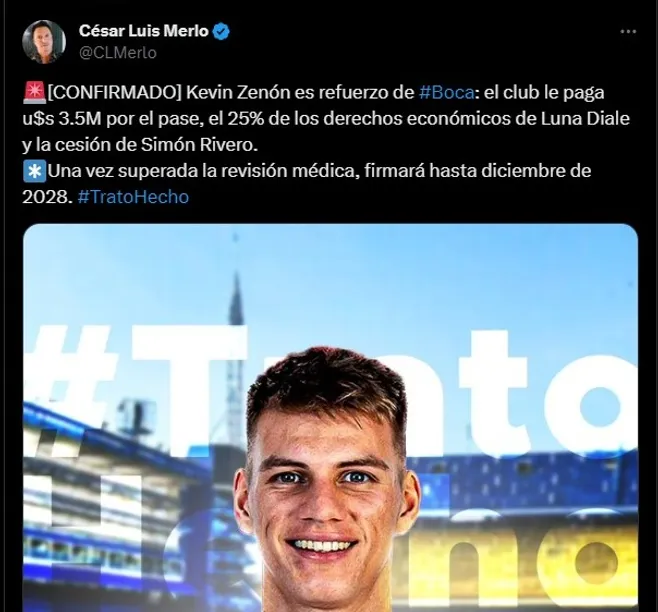 Kevin Zenón es el segundo refuerzo de Boca en este mercado de pases. El volante llega al Xeneize por 3.5 millones de dólares y el 25% de los pases de Mauro Luna Diale y Enzo Roldán. Por ende, el mediocampista se suma a Cristian Lema como nuevo jugador azul y oro de cara a la temporada 2024. Según contó César Luis Merlo, el jugador firmaría contrato hasta diciembre del 2028 con Boca.