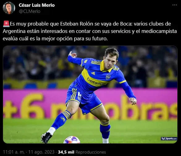 Sobre el futuro de Rolón, el periodista César Merlo aseguró: “Es muy probable que Esteban Rolón se vaya de Boca: varios clubes de Argentina están interesados en contar con sus servicios y el mediocampista evalúa cuál es la mejor opción para su futuro”. Ya hubo contactos desde Newell’s y Rosario Central.