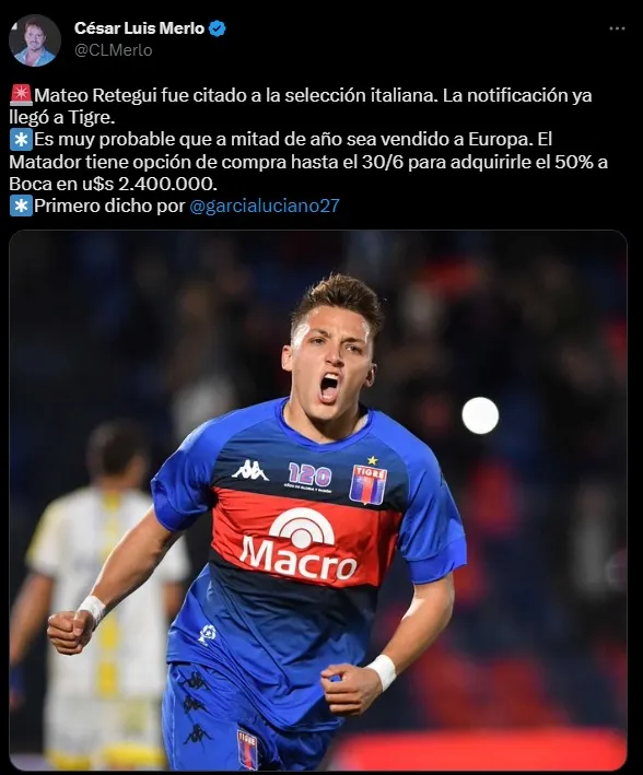 En este sentido, se sabe que uno de los jugadores que más va a estar en la mira de los clubes europeos es Mateo Retegui. Tras un gran 2022 en Tigre, el delantero se ganó el interés de muchos equipos y que sea vendido es una posibilidad más que concreta, lo que le dejaría una importante suma a Boca, dueño de su pase.