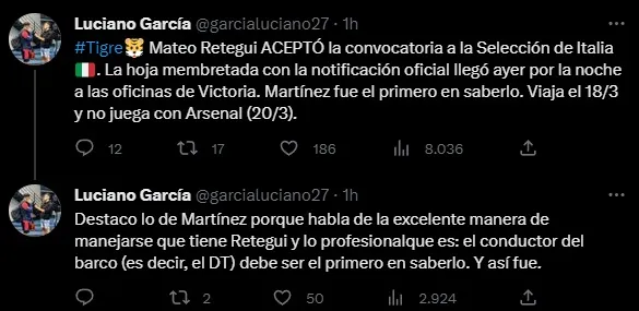 El periodista Luciano García contó que Retegui se sumará a la selección de Italia y dio detalles de la convocatoria. “Mateo Retegui ACEPTÓ la convocatoria a la Selección de Italia. La hoja membretada con la notificación oficial llegó ayer por la noche a las oficinas de Victoria. Martínez fue el primero en saberlo. Viaja el 18/3 y no juega con Arsenal (20/3)”, sostuvo.