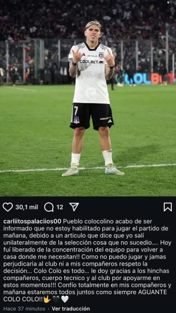 Ante esto, Carlos Palacios respondió con un mensaje en su cuenta de Instagram. Y citó: “Pueblo colocolino acabo de ser informado que no estoy habilitado para jugar el partido de mañana debido a un artículo que dice que yo salí unilateralmente de la Selección. Cosa que no sucedió…“