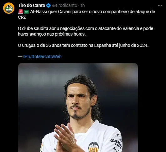 Fue el medio Tutto Mercato que confirmó: “Al Nassr quiere que Cavani sea el nuevo compañero de ataque de Cristiano Ronaldo. El club de Arabia Saudita abrió negociaciones con el delantero de Valencia y podría haber avances en las próximas horas” .