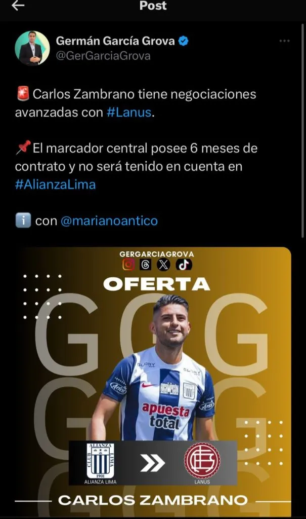 Según reveló el periodista Mariano Antico en TyC Sports, las charlas entre Zambrano y el “Granate” están avanzadas y el pase se encamina a concretarse. Al zaguero le quedan seis meses de contrato en Alianza Lima, por lo que tiene que resolver su salida. En su club actual es cuestionado y por eso una salida parece una solución que conforma al futbolista.