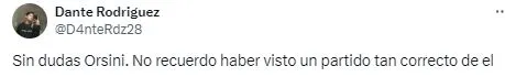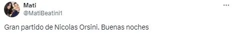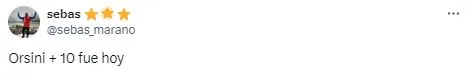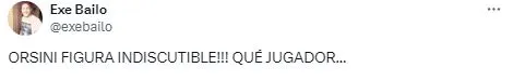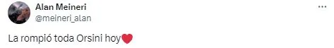 En el último turno de la jornada, el equipo dirigido por Cristian González superó al Taladro sobre la hora y Orsini aportó su granito de arena con una buena asistencia. El atacante asistió a Jerónimo Dómina y sumado a otras participaciones, los hinchas se deshicieron en elogios. “La rompió toda”, “Orsini +10” y “Ayer dio clase magistral” fueron algunos comentarios en Twitter.