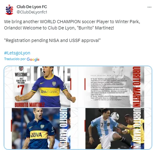 El Burrito, que ya conoce el fútbol de Estados Unidos por su paso por el Realt Salt Lake, fue presentado como figura en su nuevo equipo: destacaron sus pasos por Boca y la Selección Argentina. “Vine al Club de Lyon para ser campeón“, declaró Martínez para la web oficial.