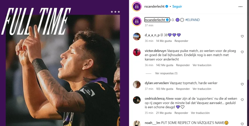 El nivel de Luis en sus primeros partidos generó fastidio en buena parte de la parcialdiad belga, pero su gol y gran tarde ante el Eupen parece haber empezado a cambiar las cosas: “Gran partido de Vázquez, trabajando para el equipo y manteniendo bien el balón. Por fin un partido con oportunidades para Anderlecht”; “Vázquez es el mejor partido, muy trabajador“; “feliz de que Vázquez haya marcado sus primeros 1 gol con el RSCA en su primer puesto titular, realmente se lo merece”, fueron algunos comentarios.