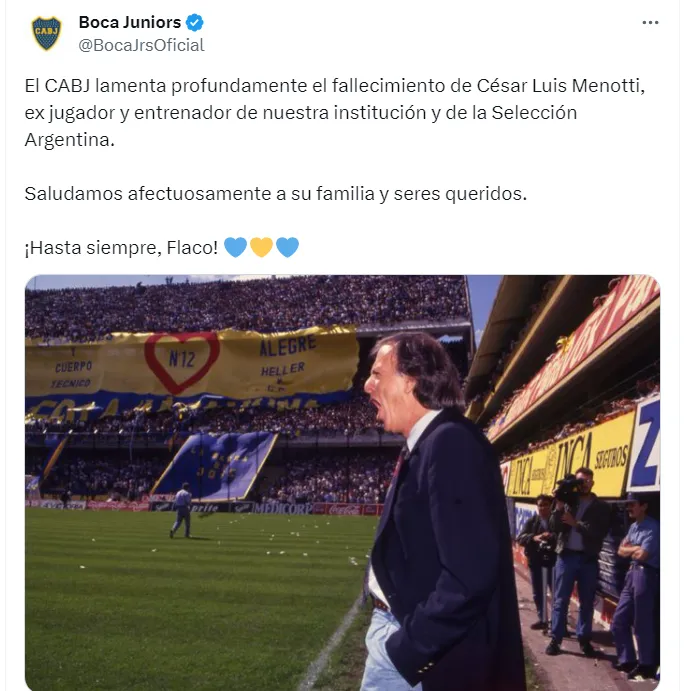 “El CABJ lamenta profundamente el fallecimiento de César Luis Menotti. Saludamos afectuosamente a su familia y seres queridos”, expresaron en las redes sociales oficiales del Club.