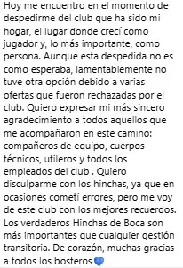 “Quiero expresar mi más sincero agradecimiento a todos aquellos que me acompañaron en este camino: compañeros de equipo, cuerpos técnicos, utileros y todos los empleados del club. Quiero disculparme con los hinchas, ya que en ocasiones cometí errores, pero me voy de este club con los mejores recuerdos“, sostuvo el volante. Y cerró: “Los verdaderos Hinchas de Boca son más importantes que cualquier gestión transitoria. De corazón, muchas gracias a todos los bosteros”.