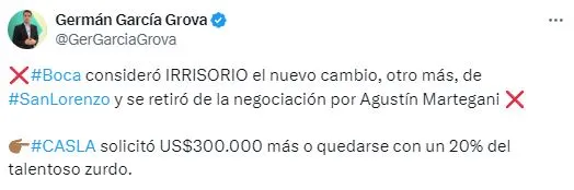 Sin embargo, la gestión dio un giro inesperado y habrá que tachar esta opción. El periodista Germán García Grova informó que Boca se retiró de la negociación al considerar como “irrisorio” el nuevo cambio del Ciclón. ¿De qué se trata? El conjunto azulgrana solicitó 300 mil dólares más o la posibilidad de quedarse con un 20% de la ficha del jugador.