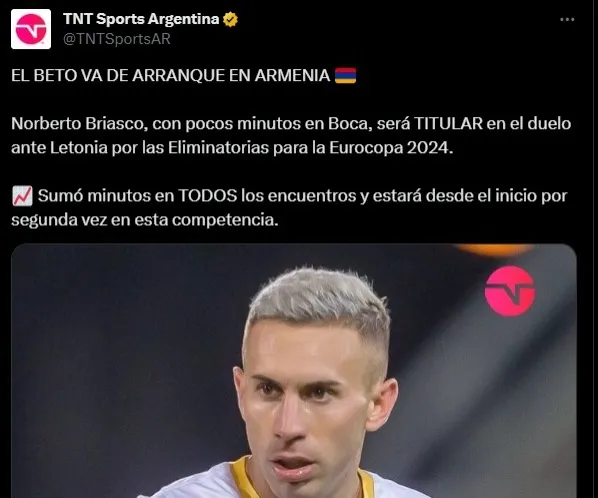 Norberto Briasco: en lo que respecta al delantero de la Selección de Armenia, “Norby” fue titular en el primer partido contra Letonia por la fecha 5 del Grupo D de las eliminatorias rumbo a la Eurocopa 2024. En el mismo, salió a los 70 minutos del segundo tiempo y su equipo perdió por 2 a 0. Sumado a esto, al tener fecha libre, el equipo del “Beto” se midió ante Macedonia del Norte en un amistoso que terminó con derrota por 3 a 1 en el cual el jugador de Boca ni siquiera fue citado.