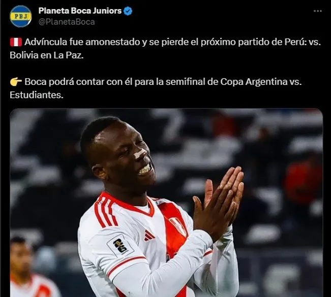 Luis Advíncula: el lateral peruano de Boca fue el jugador que más desgaste tuvo en esta fecha de eliminatorias. Tal esi así que disputó los 90 minutos en la derrota por 2 a contra Chile como visitante y también el encuentro completo contra la Argentina en suelo local. A su vez, ante la albiceleste, vio la tarjeta amarilla por lo que no podrá jugar el próximo compromiso frente a Bolivia en el mes de noviembre. ¿Estará disponible para la semifinales de Copa Argentina contra Estudiantes?