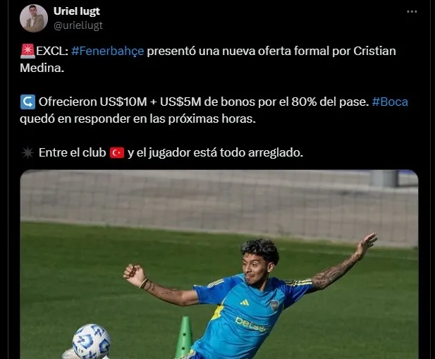 Según informó el periodista Uriel Iugt en su cuenta de “X”, Boca recibió una nueva oferta por Cristian Medina desde el Fenerbahce en las últimas horas. Y esta es de 10 millones de dólares más otros 5 millones en bonos por el 80% del pase del jugador.