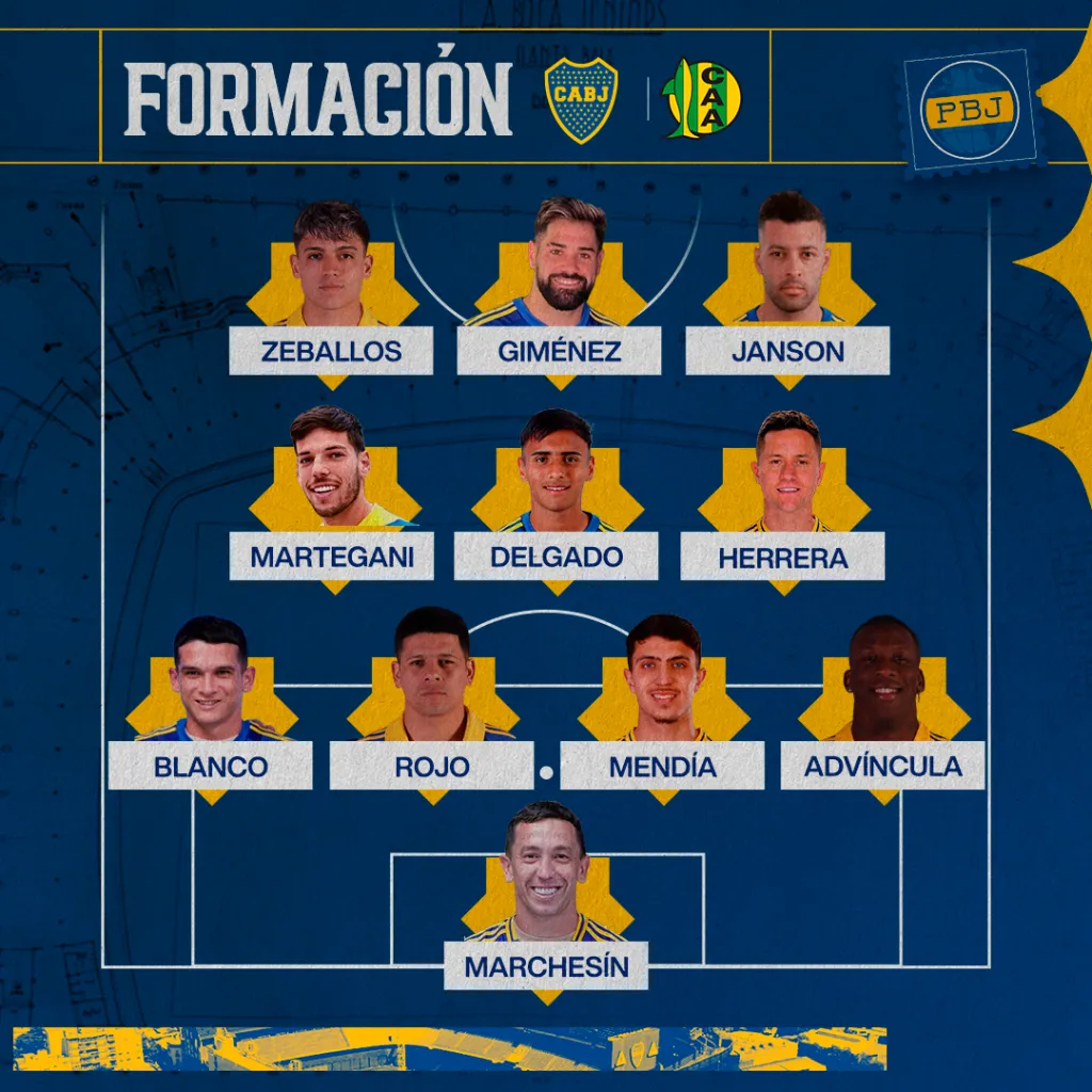 El Xeneize formará con: Agustín Marchesín; Luis Advíncula, Mateo Mendia, Marcos Rojo, Lautaro Blanco; Ander Herrera, Milton Delgado, Agustín Martegani; Lucas Janson, Milton Giménez, Exequiel Zeballos.