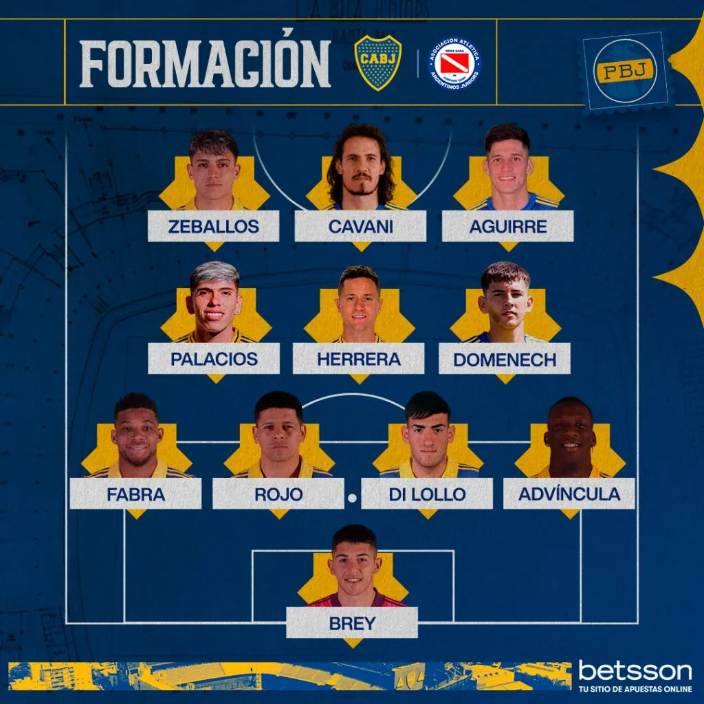 El equipo de Boca confirmado: Leandro Brey; Luis Advincula, Lautaro Di Lollo, Marcos Rojo, Frank Fabra; Camilo Rey Domenech, Ander Herrera, Carlos Palacios; Brian Aguirre , Edinson Cavani , Exequiel Zeballos.