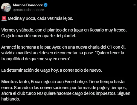 Desde que Fernando Gago llegó a Boca, a solo unos días de asumir ya tuvo que afrontar una situación con Cristian Medina. El volante estuvo muy cerca de ser vendido al Fernerbahce sobre el final del último mercado de pases, y la operación quedó pendiente para 2025.