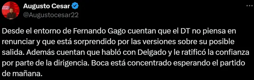 El periodista Augusto César contó que al DT le sorprendió la repercusión de la noticia y quiere saber cuál es su situación. “Gago está sorprendido por la repercusión mediática de la noticia que va a dejar de ser el DT de Boca. Es más, no descarto una reunión en un ratito nada más para saber cuál es la realidad de todo esto y quiere saber si hay una ratificación en serio o si se va a tomar una decisión después del partido de mañana. Le parece hasta ilógico si ya hay una decisión tomada”, señaló la fuente citada.