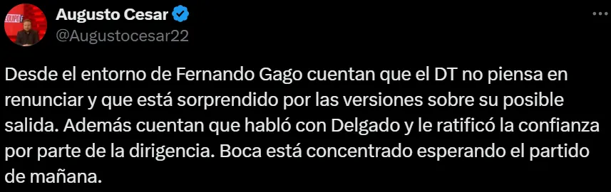 El periodista Augusto César contó que al DT le sorprendió la repercusión de la noticia y quiere saber cuál es su situación. “Gago está sorprendido por la repercusión mediática de la noticia que va a dejar de ser el DT de Boca. Es más, no descarto una reunión en un ratito nada más para saber cuál es la realidad de todo esto y quiere saber si hay una ratificación en serio o si se va a tomar una decisión después del partido de mañana. Le parece hasta ilógico si ya hay una decisión tomada”, señaló la fuente citada.