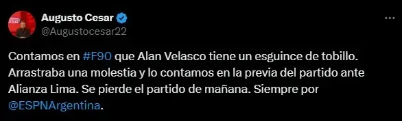 Alan Velasco no estará disponible para este encuentro por un esguince de tobillo según informó el periodista Augusto César en ESPN. El delantero viene de errar el penal decisivo ante Alianza Lima y se fue llorando tras la eliminación.