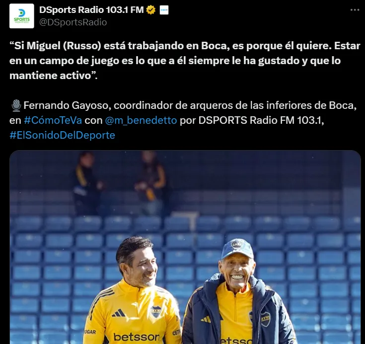 De esta manera, el ex entrenador de arqueros de Boca declaró: “Si Miguel (Russo) está trabajando en Boca, es porque él quiere. Estar en un campo de juego es lo que a él siempre le ha gustado y que lo mantiene activo”.