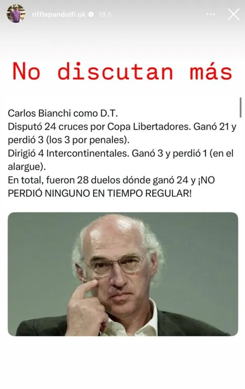 El “Rifle” que supo tener al “Virrey” tanto en el Fortín como en el Xeneize lo ubicó por encima del “Muñeco” y lo expresó con un posteo en redes sociales. En dicha publicación, aparecen datos que enaltecen al histórico entrenador en las grandes competencias y Pandolfi redondeó su publicación con un claro mensaje, para remarcar las diferencias: “NO DISCUTAN MÁS”.