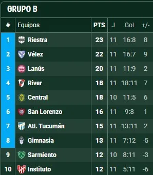 Mientras que, en la zona B, también se dieron cambios. Y por el momento los que estarían ingresando a la fase eliminatoria son Deportivo Riestra, Vélez Sarsfield, River Plate, Lanús, San Lorenzo, Rosario Central, Atlético Tucumán y Gimnasia de La Plata.