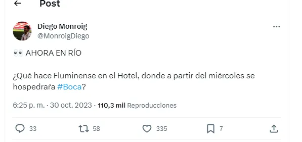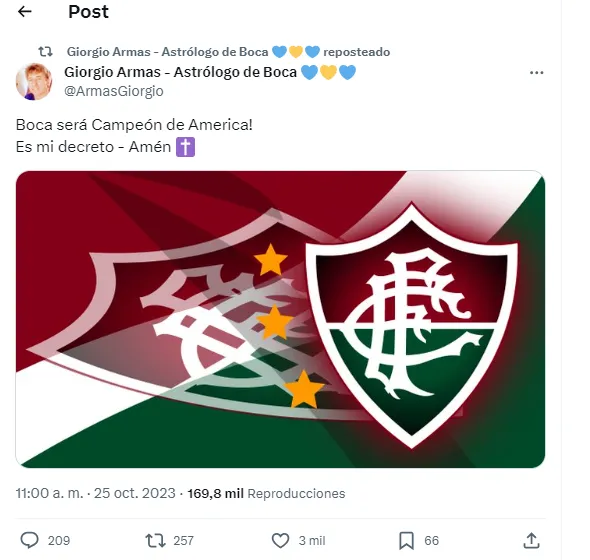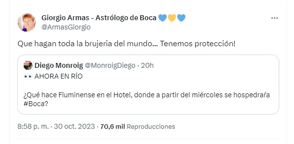 “¿Qué hace Fluminense en el hotel donde a partir de miércoles se hospedaría Boca?“, insinuó el periodista Diego Monroig. Las respuestas a su tweet estuvieron relacionadas con la especulación de que los brasileños hayan efectuado algún tipo de “brujería o maldición” en el hotel. Y ahí es donde salió a responder Giorgio Armas, el astrólogo de Boca.