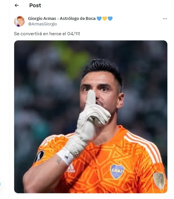 Hace algunos días, Giorgio Armas baticinó que Sergio Romero “se convertirá en héroe el 04/11”. Y se animó a afirmar en su cuenta “Boca será campeón de América. Es mi decreto – Amén”.