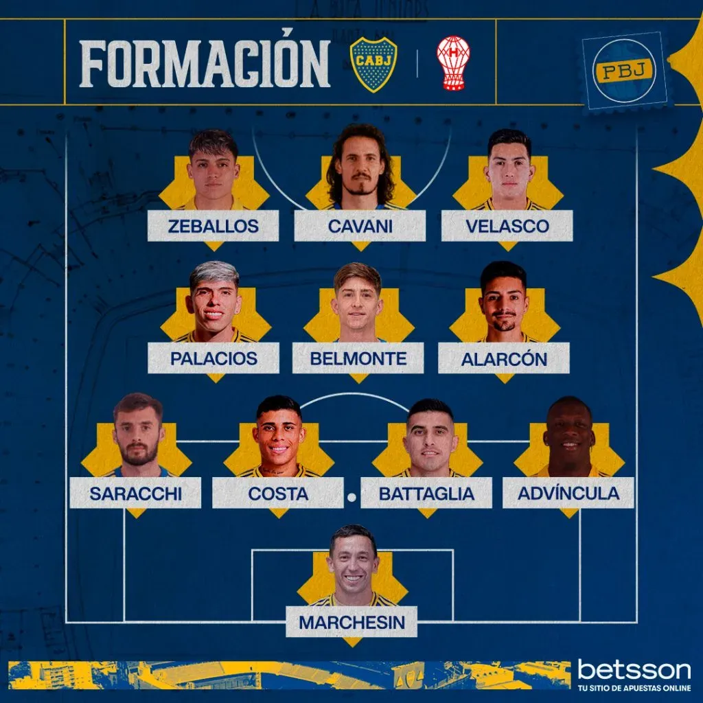El equipo de Boca confirmado: Agustín Marchesin; Luis Advíncula, Rodrigo Battaglia, Ayrton Costa , Marcelo Saracchi; Williams Alarcon, Tomás Belmonte, Carlos Palacios; Exequiel Zeballos, Edinson Cavani, Alan Velasco.