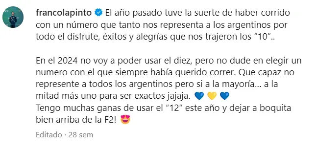 Durante gran parte del 2024, Franco Colapinto compitió en la F2 y utilizó el número 12 en su auto. “No dudé en elegir un número con el que siempre había querido correr. Capaz no representa a todos los argentinos, pero sí a la mayoría. A la mitad más uno para ser exactos”, escribió en su cuenta de Instagram. Bostero de ley.