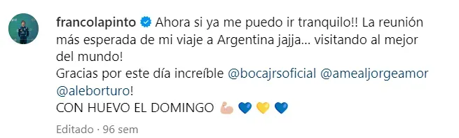 A mediados de octubre de 2021, Franco Colapinto vino a la Argentina y tuvo el honor de pisar el campo de juego de La Bombonera. Luego de esa gran experiencia, el piloto argentino compartió imágenes en sus redes sociales y escribió: “Ahora sí ya me puedo ir tranquilo. La reunión más esperada de mi viaje a Argentina”.
