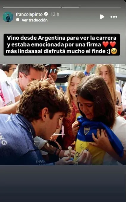 Por su parte, Franco compartió este momento en su cuenta de Instagram y en una de sus ‘stories’ escribió: “Vino desde Argentina para ver la carrera y estaba emocionada por una firma. Más lindaaa! Disfrutá mucho el finde 🙂“.