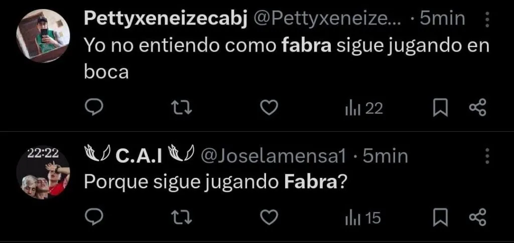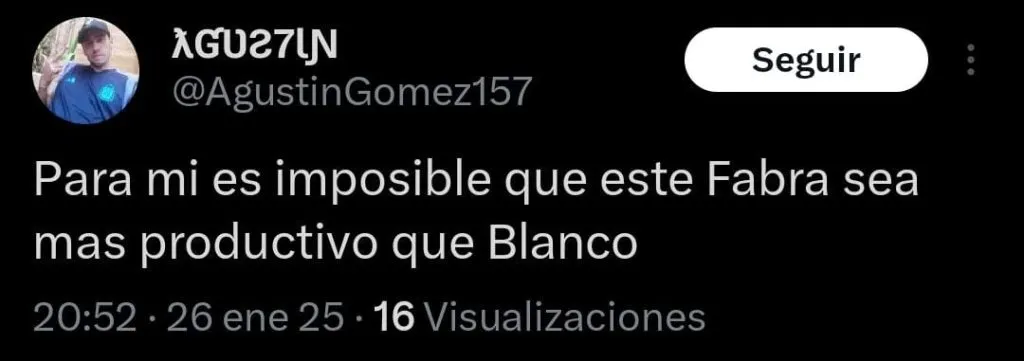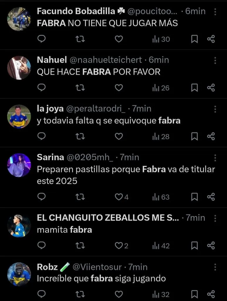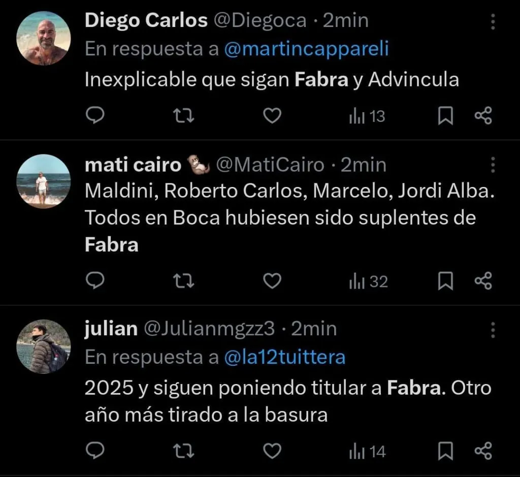 Es que el lateral tuvo una chance muy clara para poder adelantar al conjunto de la Ribera en el marcador, pero quedando de cara al arco, terminó enviando la pelota a la tribuna. Esto generó un sinfín de críticas por parte de los simpatizantes. “2025 y siguen poniendo a Fabra de titular. Otro año más tirado a la basura”, apuntó un hincha en X (Twitter). “Para mí es imposible que este Fabra sea más productivo que Blanco”, lanzó otro.