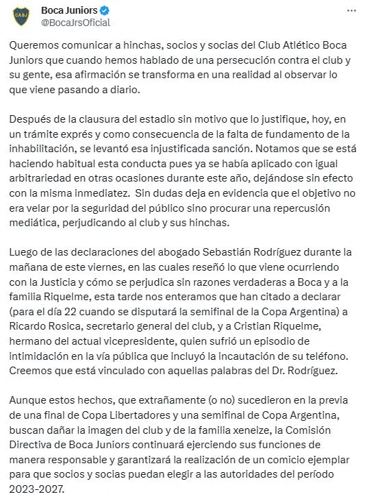 Luego del primer comunicado por la mañana del viernes, la cuenta oficial hizo su descargo mediante otra publicación. “Queremos comunicar a hinchas, socios y socias del Club Atlético Boca Juniors que cuando hemos hablado de una persecución contra el club y su gente, esa afirmación se transforma en una realidad al observar lo que viene pasando a diario”, comienza este posteo en su cuenta de Twitter.