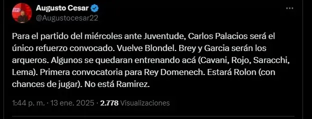 Por otro lado, Carlos Palacios será el único refuerzo de este mercado de pases que será convocado. Y se espera que sume sus primeros minutos con la casaca Xeneize (Ayrton Costa y Rodrigo Battaglia no viajarán).