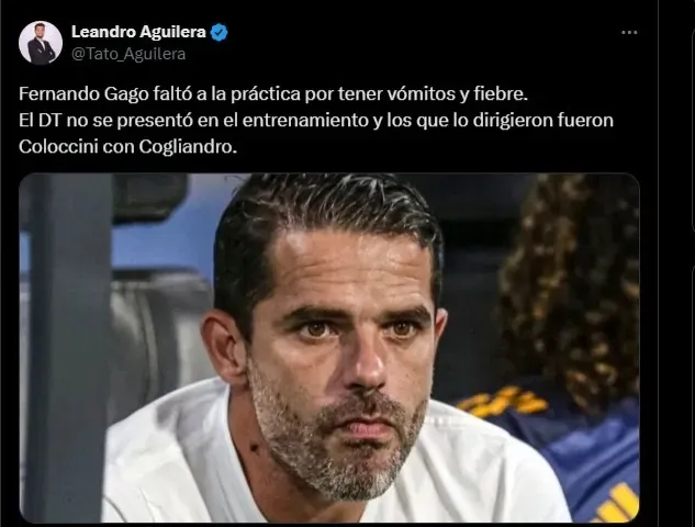 Según reveló el periodista Leandro Aguilera, Fernando Gago no fue al entrenamiento de este martes en Boca Predio. Y el motivo se debe a un problema de salud del DT.