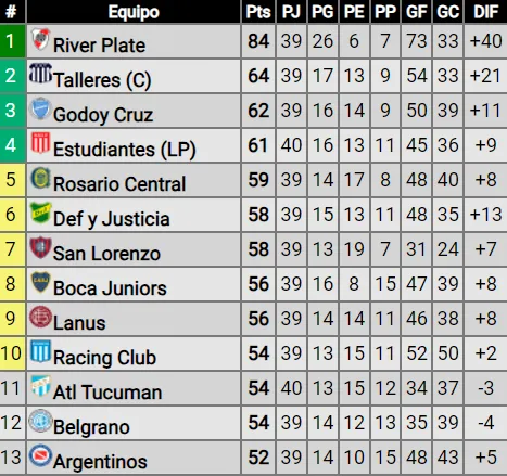El Pincha le ganó 1-0 a Central Córdoba de Santiago del Estero con gol de Guido Carrillo y superó a Rosario Central de manera transitoria para ocupar el cuarto lugar en la tabla anual. Con 61 puntos, estaría obteniendo el último boleto a la próxima Libertadores: atrás están Rosario Central (59), Defensa y Justicia (58), San Lorenzo (58) y Boca (56).Todo sus perseguidores deben jugar por la fecha 13 de la Copa de la Liga.
