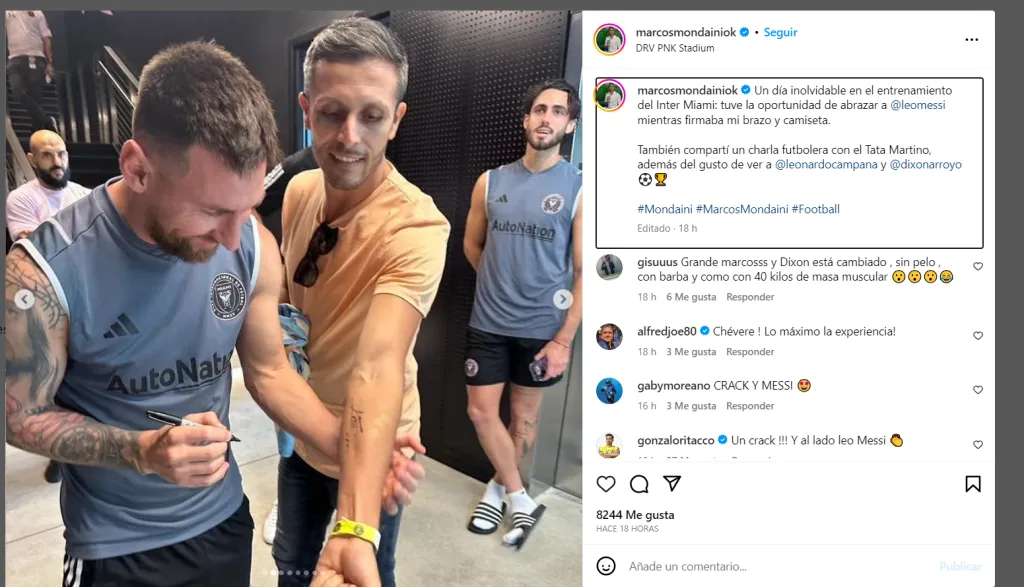 “Un día inolvidable en el entrenamiento del Inter Miami: tuve la oportunidad de abrazar a Leo Messi mientras firmaba mi brazo y camiseta“, escribió Mondaini en su cuenta de Instagram. Y no tardó en ir al tatuador más cercano.