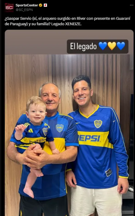 Se trata de Gaspar Servio, futbolista de Guaraní de Paraguay. Surgió en la cantera del Millonario pero nunca llegó a debutar. Pasó por varios equipos del fútbol argentino como Arsenal, Banfield y Rosario Central. “El legado“, publicó en Instagram junto a su padre y su hijo vistiendo una camiseta del Xeneize que se utilizó entre 2003 y 2004.