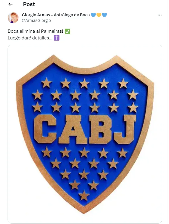 Luego de dar en la tecla ante la Academia, Girgio ya hizo dos premoniciones sobre la serie ante Palmeiras. Primero, advirtió que el rival “sufrirá golpes” durante el mes de septiembre. Y la segunda, la ás contundente: “Boca elimina a Palmeiras. Luego daré detalles…”