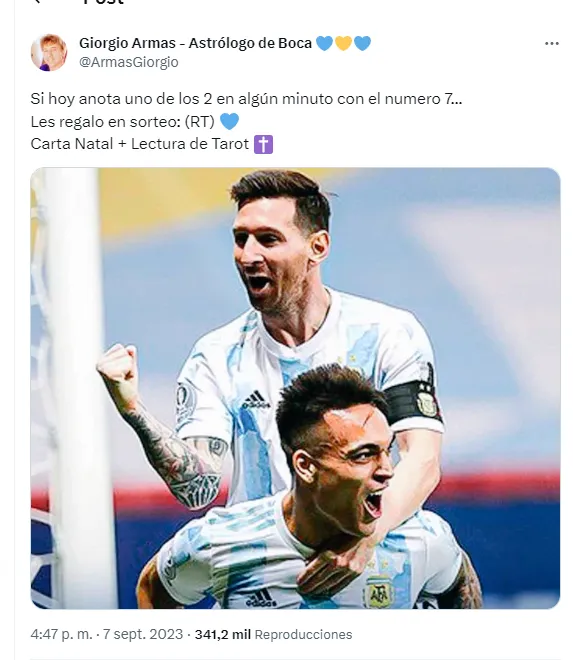 Ahora, metió un tremendo pleno con la Selección Argentina. Antes del partido, subió una foto de Lionel Messi y Lautaro Martínez. Y escribió “Si hoy anota alguno de estos dos en algún número con 7… Les regalo un sorteo“. ¿En qué minuto anotó Messi? En el 77:07.