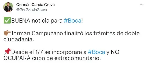 Según indicó el periodista Germán García Grova, “Campuzano finalizó los trámites de doble ciudadanía y no ocupará cupo de extracomunitario“. De esta manera, dejará un puesto vacante para estos seis lugares que permite el reglamento de AFA.