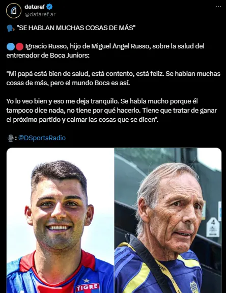 Ignacio Russo, su hijo y delantero de Tigre, habló en DSports Radio y aclaró cómo está el entrenador y cómo vive este duro momento del Xeneize. “Mi papá está bien de salud, está contento, está feliz. Se hablan muchas cosas de más, pero el mundo Boca es así”, señaló el futbolista del Matador de Victoria.