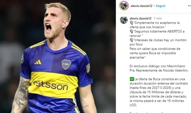 Sin embargo, el jugador y un entorno no aceptan estas condiciones puestas por el club de la Ribera y de momento Valentini no renovará su contrato. Por último, su agente sentenció: “Intereses de clubes hay un montón por Nico. Pero sin saber que condiciones de venta quiere Boca es imposible acercarlas”.