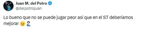Juan Martín del Potro fue uno de los que posteó en “X” (Twitter) y no ocultó su descontento con el rendimiento de los dirigidos por Russo en una irónica publicación. “Lo bueno que no se puede jugar peor, así que en el ST deberíamos mejorar”, escribió la “Torre de Tandil” apenas finalizó el primer tiempo. Finalmente, el Único Grande pudo jugar peor y el gol de Matko Miljevic lo dejó con las manos vacías.