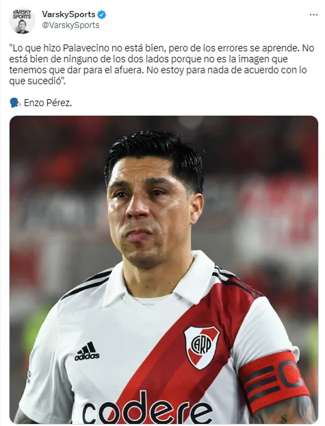 Y agregó que “lo que hizo Palavecino no está bien, pero de los errores se aprende. No está bien de ninguno de los dos lados porque no es la imagen que tenemos que dar para el afuera. No estoy para nada de acuerdo con lo que sucedió”.